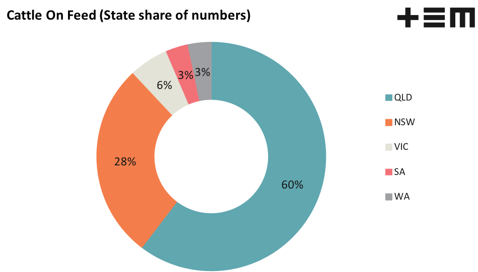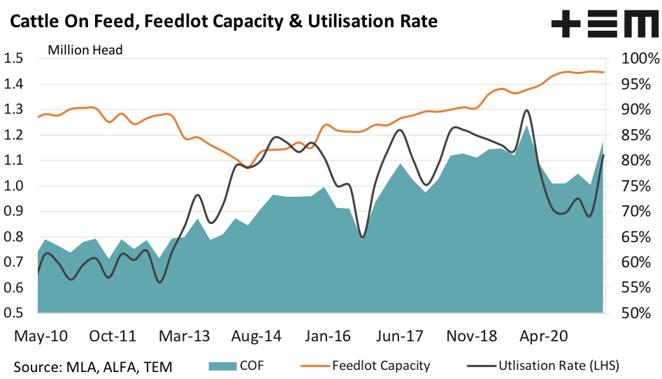 The lift in national COF volumes saw the capacity utilisation ratio rise from 69% to 81%, which is the highest level achieved since December 2019. Queensland, which holds the most cattle on feed in the country at 60% of the share also dominates the capacity utilisation ratio with feedlots sitting at 85% capacity.