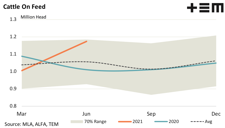 The increase in cattle on feed in the June quarter represents levels that are 11% higher than the five-year average level for June and sits just below the upper end of the normal fluctuations seen in the last five years for COF figures for June.