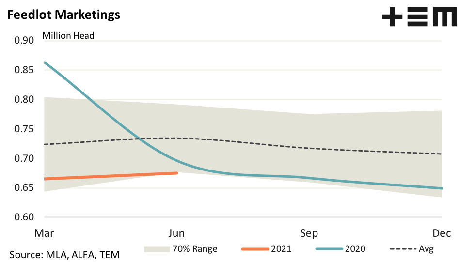 Cattle marketings gained less than 2% over the quarter to register 675,302 head marketed, this represents levels that are 8% below the five-year June average for cattle marketings.