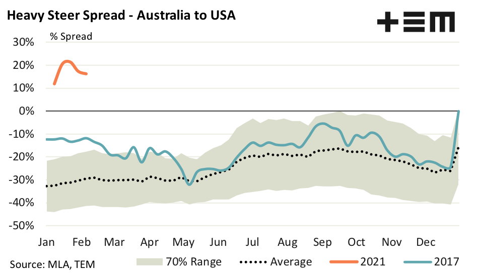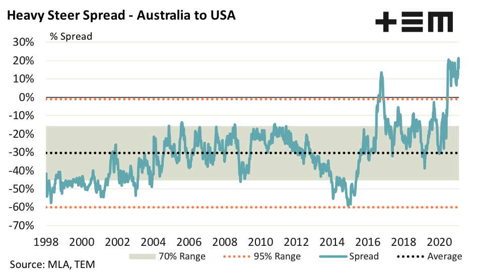 This is a record premium level and it doesn’t happen often as the long term price spread trend highlights. For more than two decades the long term average spread for Australian to US heavy cattle sits at an average discount spread of 30%, with a “normal range that sits between a 15% to 45% discount. Having the spread above parity (into premium territory) or below a discount of 60% would be considered extreme.