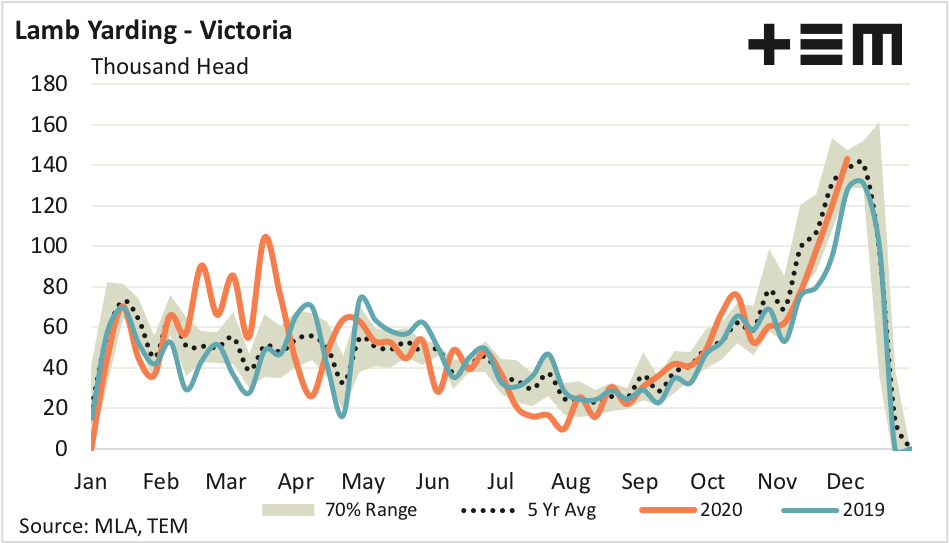 Following the five-year average weekly trend Victorian sale yards have seen lamb throughput levels reach 143,116 head, putting volumes 4% ahead of the average seasonal pattern for this time in the year. There is likely to be one or two more weeks of large volumes before the season winds down for the Xmas recess.