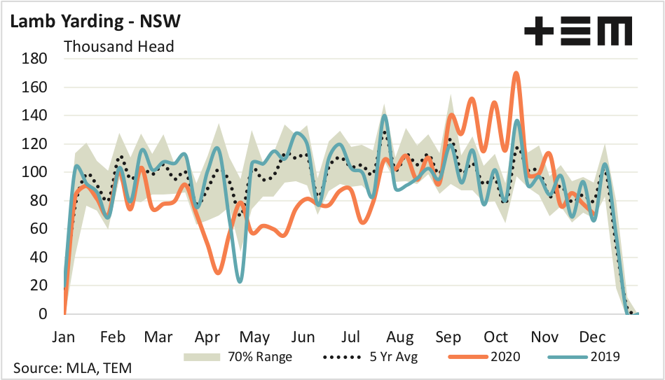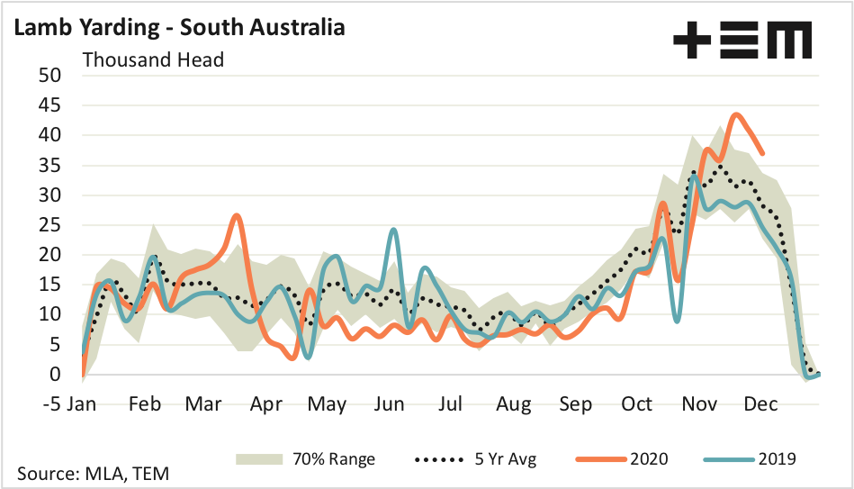 South Australian yardings have already peaked for the season with lamb throughput falling for the second consecutive week to see nearly 37,000 head of lamb presented. NSW lamb throughput levels posted the lowest weekly figures since winter with just shy of 71,000 head yarded.