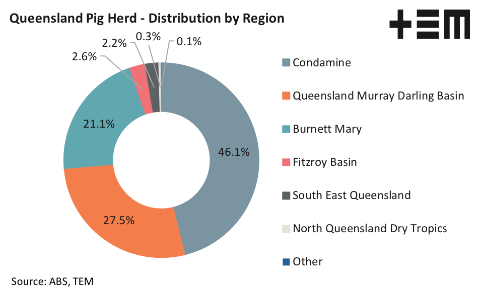The distribution of the pig herd within Queensland is centred within three regions: Condamine, Burnett Mary and Queensland’s Murray Darling Basin. These three regions account for nearly 95% of the total pig herd within the state.