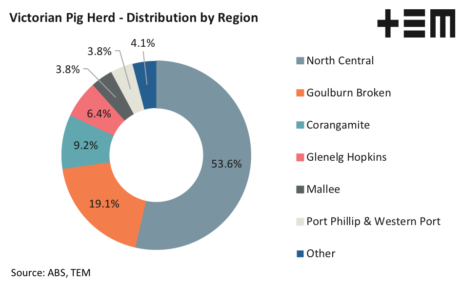 The Victorian pig herd is dominated by the North Central region with more than half of the pig population residing in this region. The top three regions for pig numbers in Victoria are North Central, Goulburn Broken and Corangamite which hold nearly 82% of the state’s pigs.