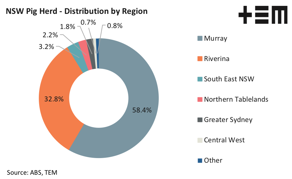 New South Wales holds around 435,000 pigs, or just over 19% of the national herd. The distribution of pigs across NSW is dominated by the regions of Murray and Riverina. Combined, these two areas contain approximately 91% of the pig tally in NSW.