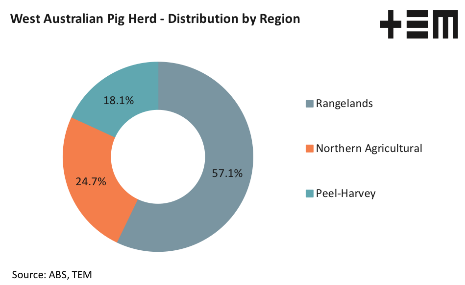 The West Australian pig herd is estimated at nearly 340,000 head or around 15% of the national total. The distribution of pigs within the state is limited to three regions: Rangelands, Northern Agriculture and the Peel-Harvey area. The Rangelands region dominates the states pig herd distribution, accounting for nearly 60% of the state’s herd.