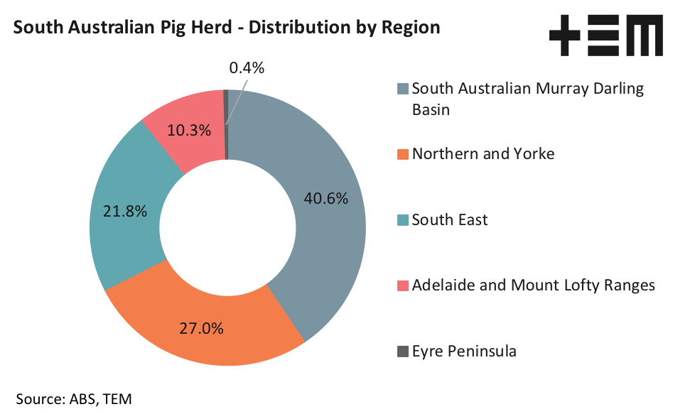 There are nearly 323,000 pigs located within South Australia, this represents about 14% of the national pig herd. Within South Australia the top three regions of Murray Daring Basin, Northern & Yorke and the South-East contain nearly 90% of the pig population for the state.