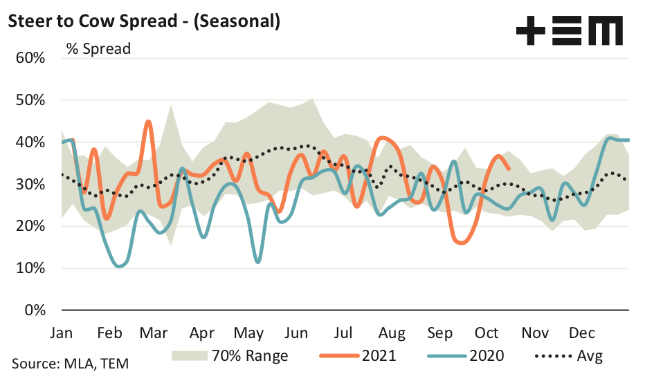 Currently the spread sits at a premium of 33.7% indicating that there isn’t any favouring of cows at the saleyard. Although, as the seasonal chart indicates this wasn’t the case in early September when the spread narrowed toward 16% and moved outside of the range that would be considered normal for this time in the year (as outlined by the 70% range boundary).