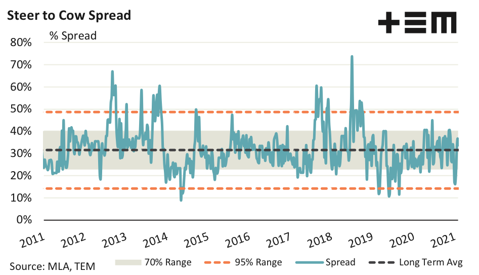 Much of the season the steer/cow spread has remained within the normal range, suggesting no strong preference for steer nor cows is being exhibited. Contrast this to the early part of 2020 when the spread remained a relatively narrow levels from February through to June showing some good competition for breeding stock in favour of steers.