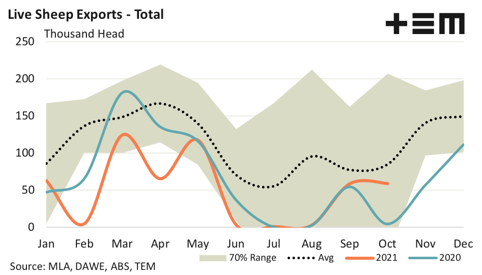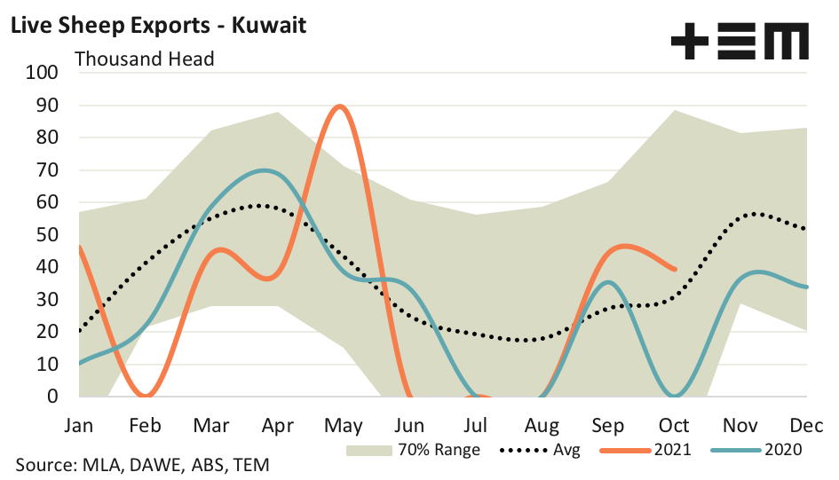 Live sheep export flows from Australia in October moved sideways with the second consecutive month of nearly 59,000 head shipped. There were 58,954 head of sheep transported during October, which is around 30% under the five-year average pattern for this time in the season. The primary destination for live sheep from Australia is Kuwait, accounting for 60% of flows so far this season. Kuwaiti demand is running 28% above the October average levels with 39,396 head noted as shipped last month.