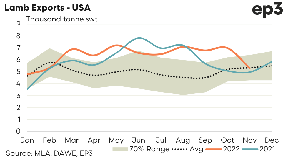 Aussie lamb exports to the USA have been riding high since March 2022, running above the upper end of the normal range in export flows for much of the year. However, November has seen lamb export volumes ease toward the average trend. Aussie lamb exports to the USA declined by 24% over November to see 5,299 tonnes shipped, which is the first time monthly volumes of lamb to the USA have dipped under 6,000 tonnes since February.