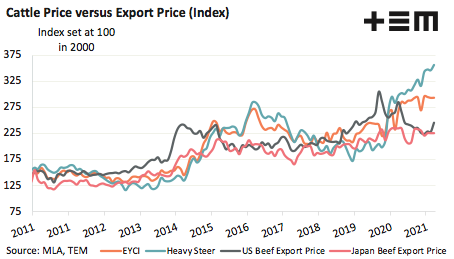 We created a quick index of the EYCI, National Heavy Steer and US/Japanese beef export prices, setting the start of 2000 as the base at 100. Since the start of 2020 domestic prices have well and truly out performed beef export prices to two of our key trading destinations.