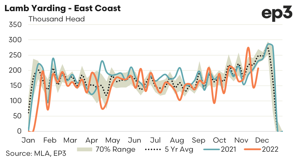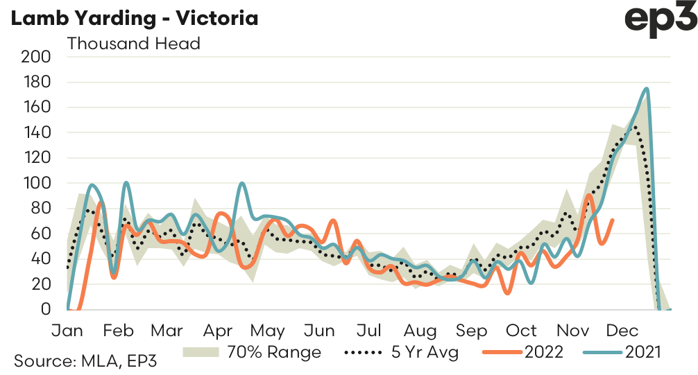 There was a 34% lift in saleyard numbers in Victoria from the previous week, but that was a particularly low base to bounce off at nearly 53,000 head. The week ending 25th November saw 70,956 head of lamb presented at Victorian saleyards, which is 44% under the normal flush volumes seen at this time in the year. It’s fair to say that it is pretty much a half flush for Victoria presently.