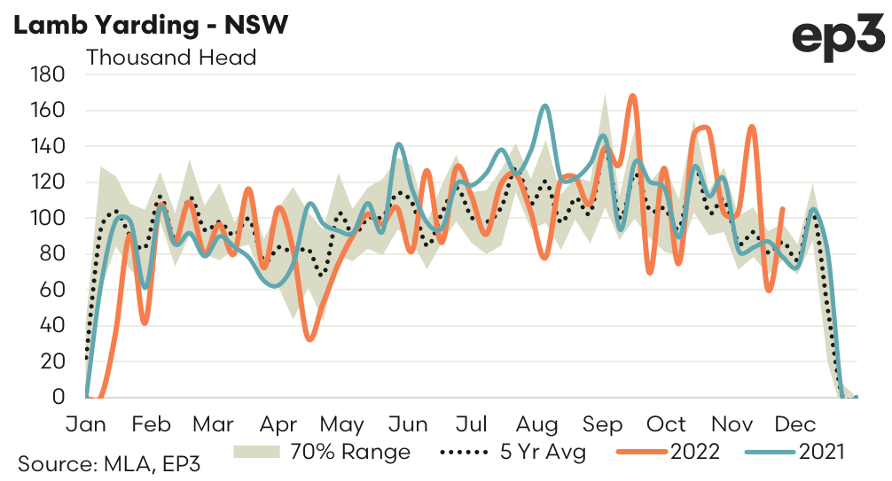 NSW made up for the abnormally low Victorian lamb volumes with nearly 105,000 head of lamb throughput, a 73% gain on the week prior, but again this was off a relatively low base. NSW lamb yarding levels are at least sitting above the seasonal average for this time of the year with 21% more lambs yarded than the five-year average trend shows.