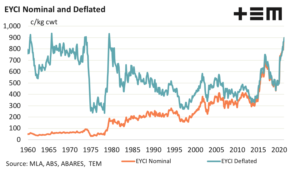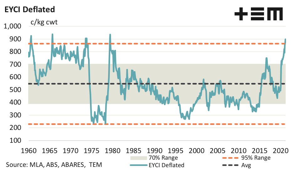 The long term deflated EYCI sits at 546c/kg cwt, as outlined by the black dotted line. The grey shaded 70% range shows that the EYCI has fluctuated between 388c to 705c/kg cwt for 70% of the time since the 1960s. The 95% range shows that movements below 158c or above 863c/kg cwt would be considered extreme.