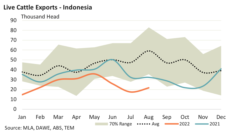 Uncharacteristically low levels of live export cattle volumes to Indonesia continue to hamper the Australian trade. August normally sees a seasonal peak in volumes to Indonesia but the month managed just a meagre 4,195 additional head of cattle exported to see just 21,697 for August. This represents levels that are 63% below the average levels normally sent to Indonesia in August, according to the last five years of trade data.