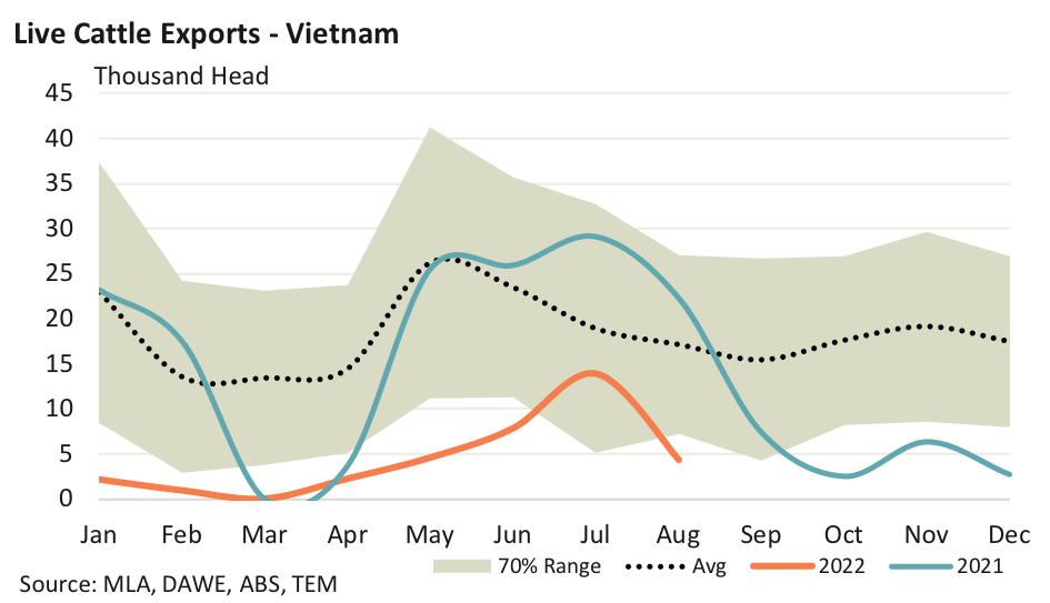 After a promising July Vietnamese demand for Aussie live cattle also turned south. Just 4,309 head was sent to Vietnam from Australia over August which is 75% below the August five-year average trend. So far this year Vietnam have taken just 31,524 head of Australian cattle, back in 2020 there were single months were they traded larger volumes.