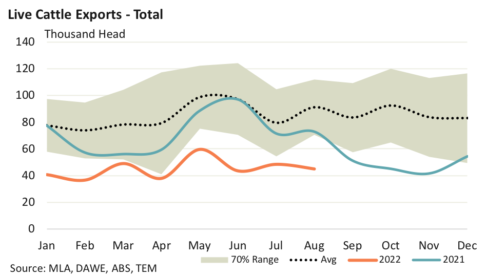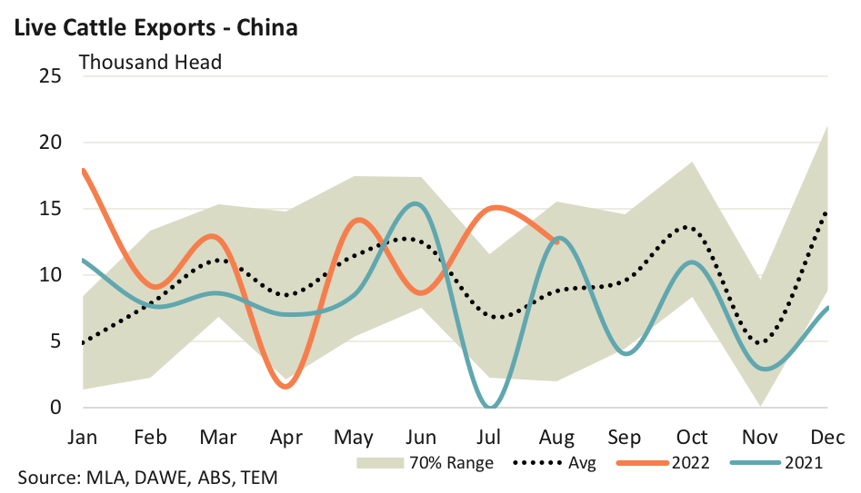 At least China continues to export levels above the average trend with 12,491 head registered exported over August. Despite the August volumes easing nearly 17% the current trade to China sits 42% above the five-year average for August.