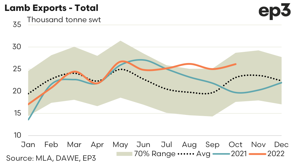 Aussie mutton exports maybe running below trend, but the same cannot be said for our red hot lamb export sector. Australian lamb exports in October increased 4% to hit 26,144 tonnes swt, which makes the third time this year that lamb exports have gone above 26,000 tonnes. Current lamb exports are riding 13% above the five-year average pattern for October.