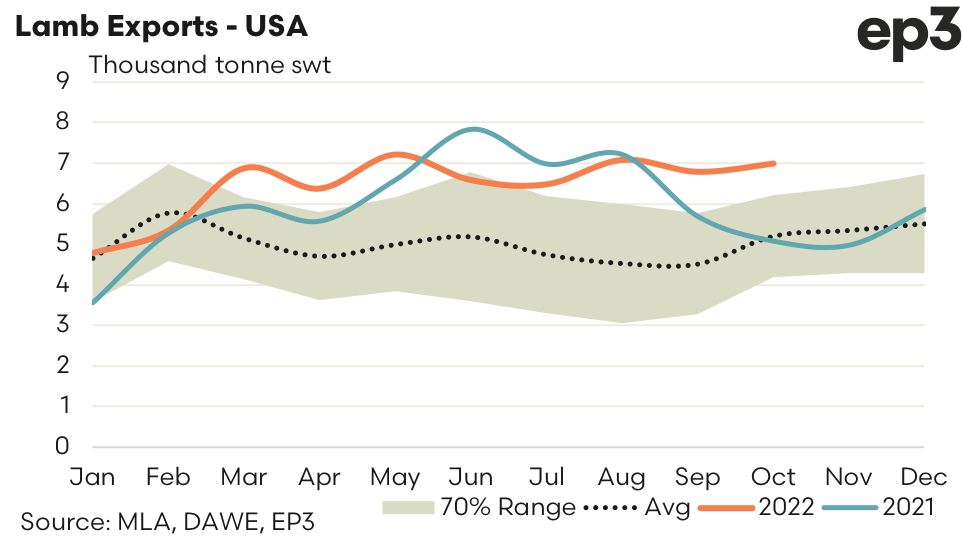 It is continued strong demand from the USA that is underpinning the total lamb trade volumes. Lamb exports to the USA from Australia lifted 3% over October to see 6,983 tonnes swt consigned, this represents levels that are 34% above the five-year average pattern for October.
