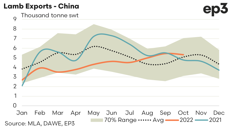 Lamb export demand from China sits above average levels too. At 5,319 tonnes for October Chinese demand for Aussie lamb is placed nearly 5% above the normal levels seen, as per the five-year average for October.