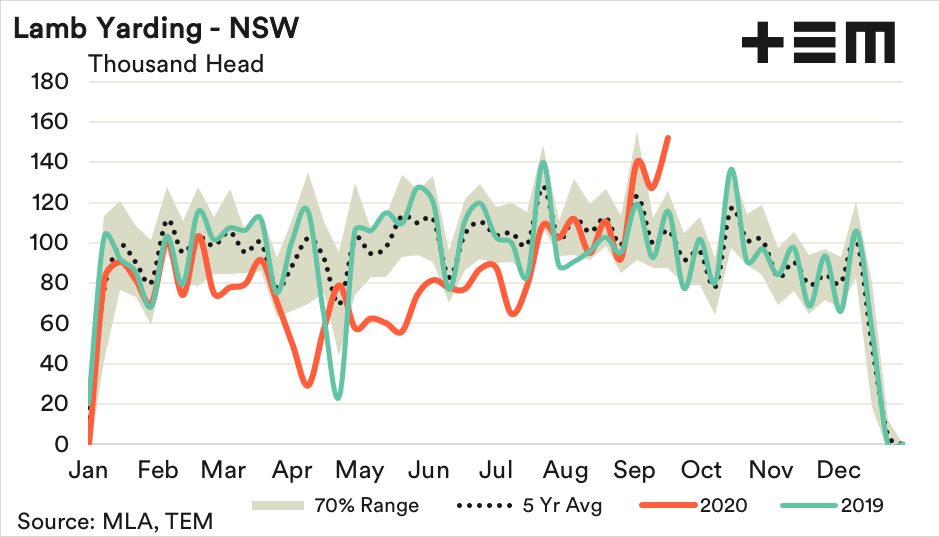 Spring has started strongly in NSW with lamb yardings for the first three weeks of September averaging levels 27% ahead of the five-year trend.