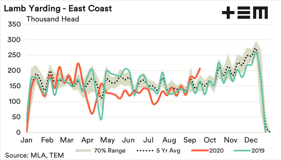 The increased lamb throughput in NSW helping to drive East coast weekly lamb yarding level above 200,000 to sit nearly 29% ahead of the five-year average seasonal pattern.