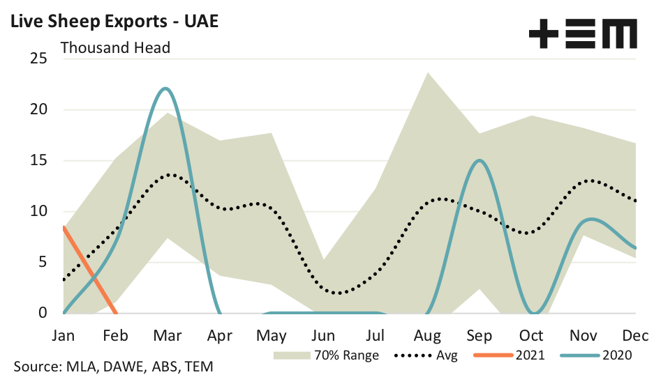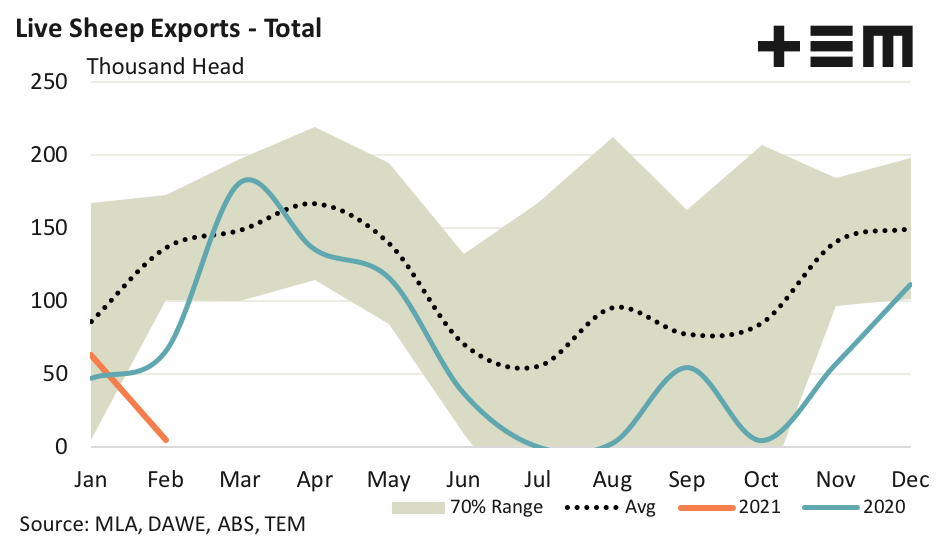 The Department of Agriculture, Water and Environment (DAWE) live sheep export data for February 2021 recorded levels consistent with the northern hemisphere summer moratorium with just 4,753 head of sheep consigned.