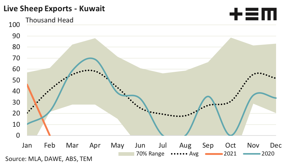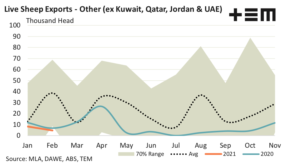 None of the normal middle eastern destinations (Kuwait, Qatar, Jordan, UAE) took any Australian sheep over February with nearly 60% of the flows going to Malaysia. The meagre February flow of live sheep exports represents levels that are a massive 97% under the five-year February average and 93% under the level seen during February 2020.