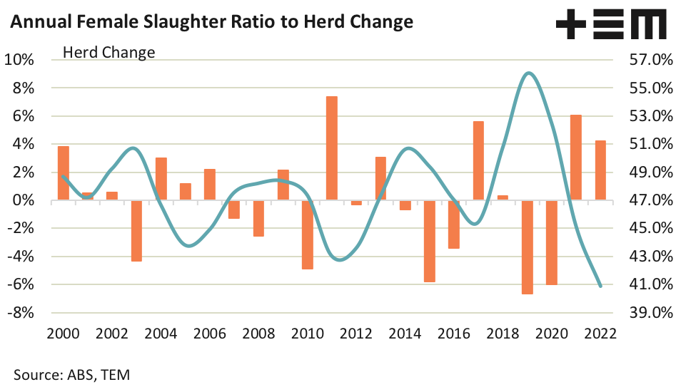 Meat and Livestock Australia are forecasting an increase to the herd of 4.2% for 2022, but if the FSR can remain this low for the rest of the year we may see a stronger rebuild occur. In analysis released in March 2022 we modelled the likely level for the FSR for the first quarter of 2022 and this suggested we were sitting below 41%. The ABS data released this week confirms the strength of the current herd rebuild phase with the quarterly FSR coming in at 40.9%, down from 42.9% in the final quarter of 2021.