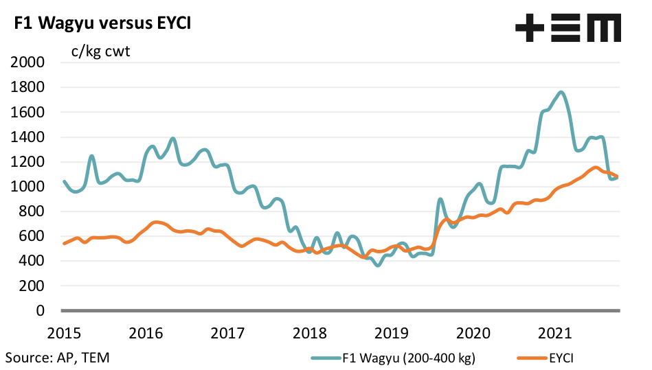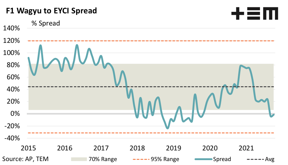 On a percentage spread basis, the F1 Wagyu premium has eroded from near 80% last year to relatively flat premiums currently. The last time we saw this kind of erosion to the premium was when the Wagyu market was somewhat flooded with first cross stock and Wagyu premiums (at least those traded via Auctions Plus) went to a discount spread during 2018/19. At the time it was claimed among industry participants that Wagyu traded direct were still earning premiums (circa 30-40%) but the F1 Wagyu stock traded on the Auctions Plus platform were there to be cleared if unable to move them via alternative channels at a premium price.