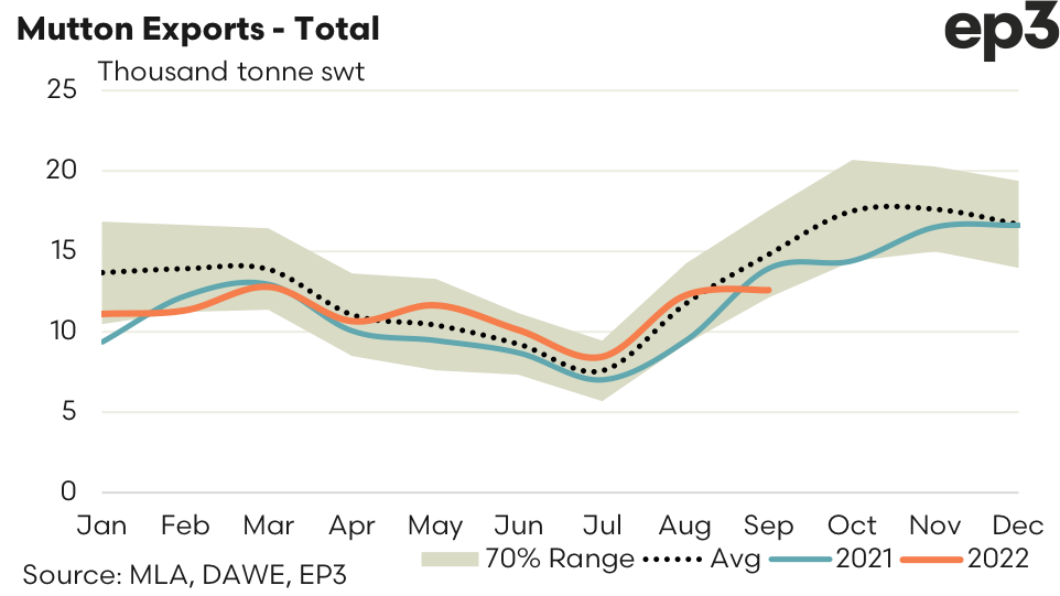 Total mutton exports from Australia for September increased just 3% over the month to register 12,622 tonnes swt consigned. After five months with export flows above the five-year average trend the lacklustre trading in September saw monthly volumes slip under the average pattern to sit 15% below the average trend.
