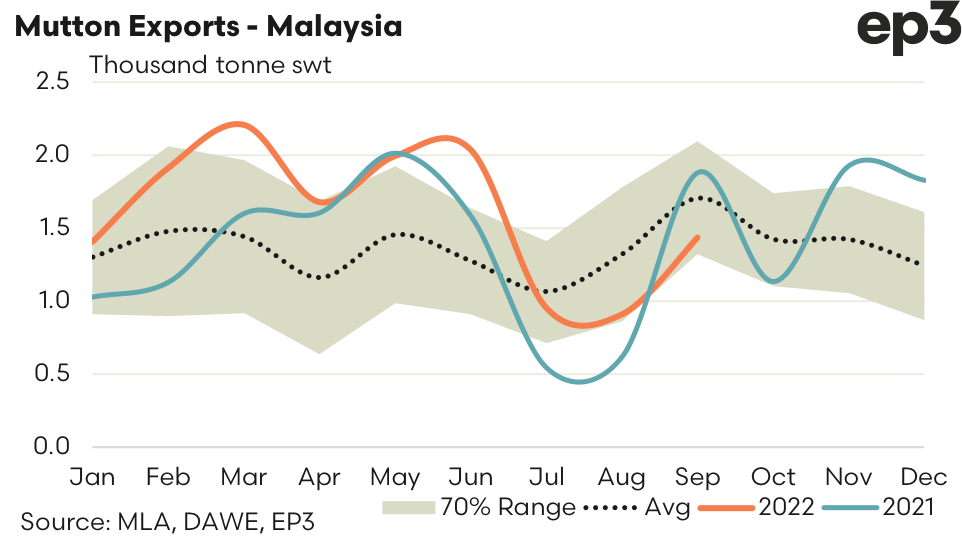 After displaying average volumes 38% above the five-year trend from January to June mutton flows from Australia to Malaysia dipped under the average pattern in July and has remained under the average trend to September. Despite the lower than average volumes in September, Malaysia managed to post a 58% lift in mutton flows from the levels seen in August to register 1,433 tonnes shipped in September. The September mutton trade volumes to Malaysia are sitting 16% below the five-year average for the month.