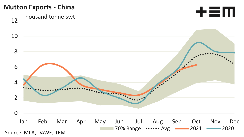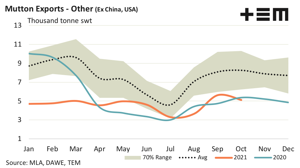The Australian mutton trade to other destinations (excluding USA and China) remain subdued with volumes easing by 9% in October to see 5,127 tonnes swt consigned, mirroring the levels seen during October 2020. Normally at this time of the year volumes are closer to 8,200 tonnes, as highlighted by the five-year average pattern for October, so other destinations are running 38% below trend.