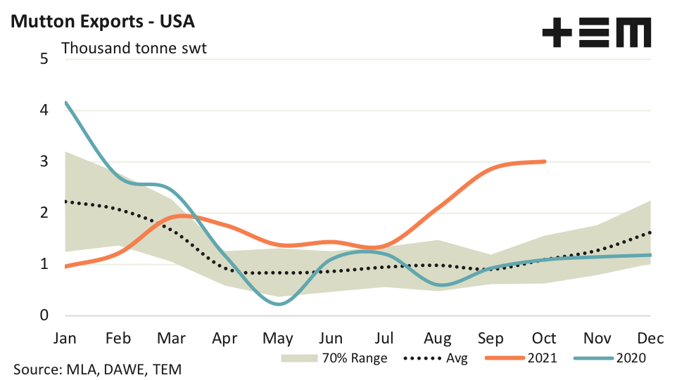For the second month in a row USA demand for Aussie mutton is sky high with 3,008 tonnes recorded exported for October. This is a 5% lift on the already incredibly strong volumes seen in September and puts current mutton flows for October 176% above the normal five-year average seasonal pattern for this time in the year. Indeed, for the season thus far Aussie mutton exports to the USA are running 44% above the average trend.