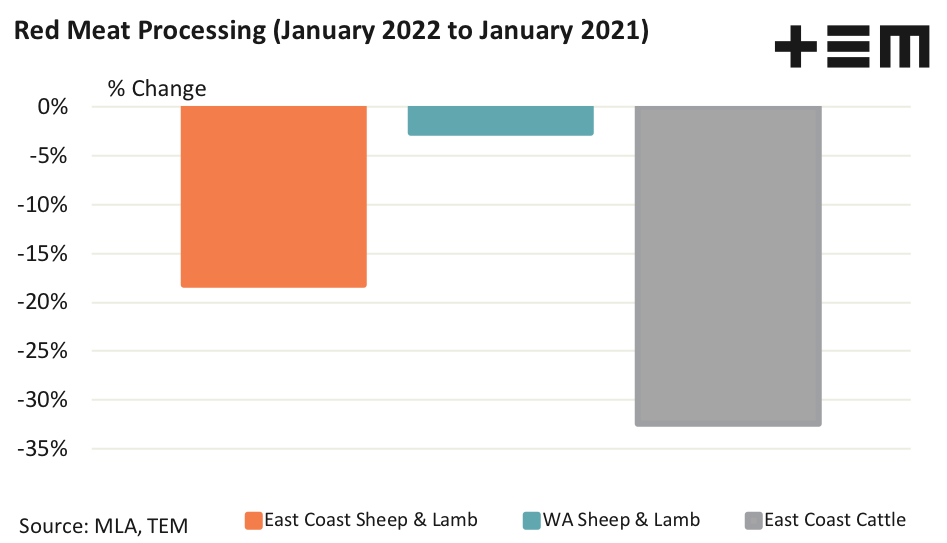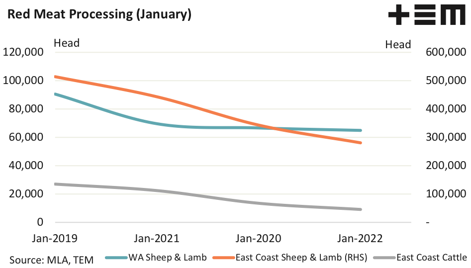 The rapid spread of the Omicron variant has seen the nations processing sector further hampered by workforce constraints with some abattoirs reporting staff absences of 30% to 50%. The impact of the spread of the virus within meat processing has been keenly felt across the east coast with significantly reduced slaughter volumes being seen since the start of 2022. Although, over in Western Australia the combination of tight border policy and effective control of the spread of Omicron has seen limited disruption to the meat processing volumes.