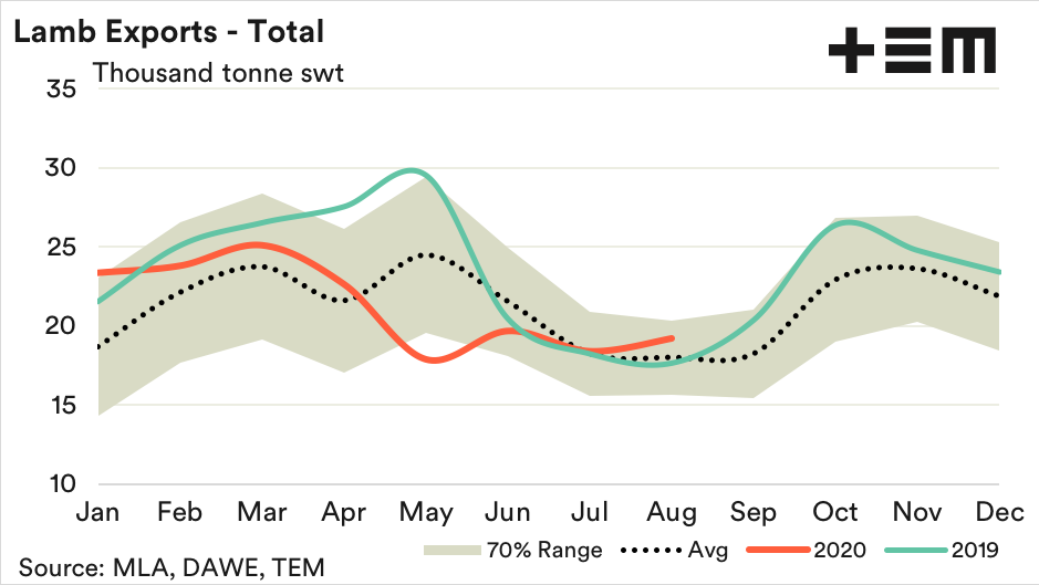 The Department of Agriculture Water and the Environment (DAWE) release of the August trade figures shows an improvement on lamb and sheep export volumes as weaker domestic prices counteract the appreciation of the Australian dollar.