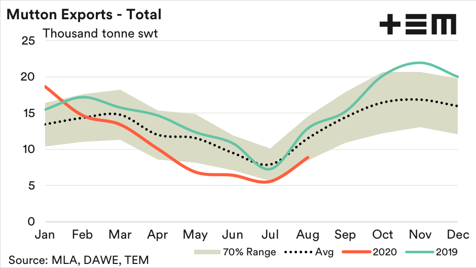 - Total mutton exports gained 59% to record 8,864 tonnes exported for August.