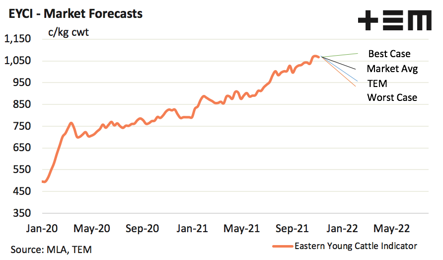 The MLA industry forecast for the Eastern Young Cattle Indicator (EYCI) as at the end of the year has been revised up. The average of participants forecast is for the EYCI to finish 2021 at 1020c/kg cwt, which is nearly a 17% upward revision from the 874 cents expected in the July outlook. Industry participants have a potential range of 1087c/kg to 946c/kg of where young cattle price may end the season. EP3 originally forecast an EYCI of 920 cents in the July update and we have revised this up by 4%, to come in at 960 cents by the end of December 2021.