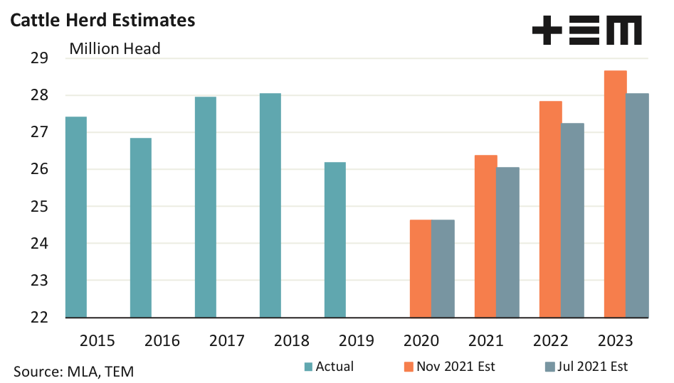 The pace of the rebuild is going to be quicker than expected in 2022 and 2023 also, with MLA adding another 2.2% to their July estimates for each of these years. The Australian herd is anticipated to be 27.8 million head in 2022 and will reach 28.6 million head in 2023.