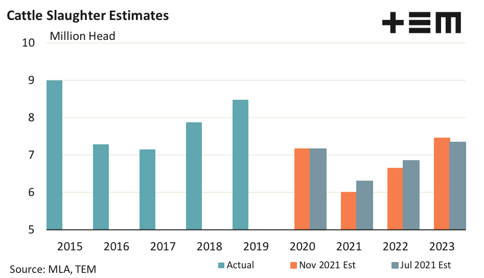 This further adjustment down in slaughter is somewhat unsurprising and the EP3 team foreshadowed the potential for a 6 million head annual slaughter figure in an article from July 2021. Slaughter in 2022 is also revised down by nearly 3% from the MLA July estimates, with the November outlook now forecasting 6.65 million head expected to be processed.