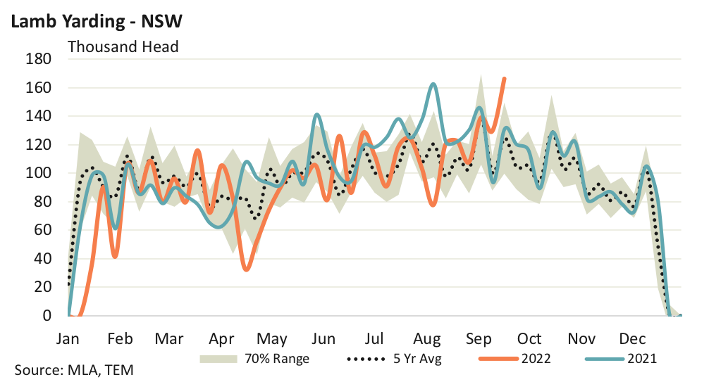 The week ending 16th September saw a rush of lambs to the saleyard in NSW. Weekly NSW lamb throughput swelled to 166,469 head, an increase of 28% on the previous week’s volumes.