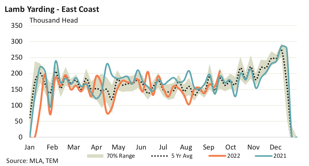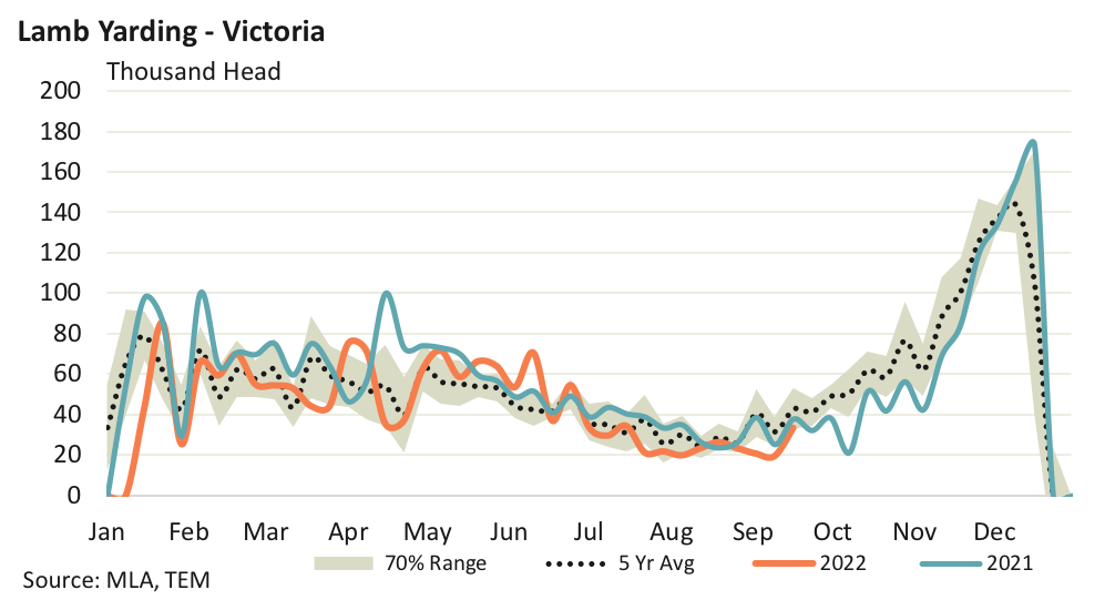 In contrast, Victorian lamb yarding levels are only just beginning to awake from their winter slumber. There were 33,569 head of lamb presented at Victorian sale yards for the week ending 16th September, which was a lift of 70% on the week prior. Despite the strong gain over the week Victorian lamb throughput sits 22% under the five-year average level for this week in the year.