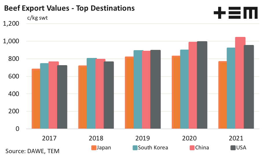 Over the last five years Japan has seen their beef export values gain 21% from 679c/kg in 2017 to 824c/kg in 2020, only to see a 7% decline to 762c/kg swt in the 2021 season. In contrast, China has seen beef export values continue to grow progressively each year from 761c/kg in 2017 to 1038 c/kg in 2021 (a gain of 36%).