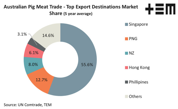Analysis of the trade flow of fresh, chilled and frozen pig meat out of Australia on a value basis over the last five years indicates that southeast Asian nations dominate the trade. Singapore has taken nearly 56% of the total value of Australian pork exports. Outside of the Asian sphere, Papua New Guinea and New Zealand feature prominently, holding approximately 13% and 8% of the Australian export value, respectively.
