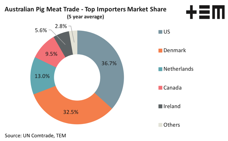 In terms of pork import flows into Australia, key supply nations are dominated by North America and the European Union. Approximately 46% of imported fresh, chilled or frozen pork into Australia comes from either the USA or Canada. Meanwhile, around 51% is supplied by the EU nations of Denmark, Netherlands or Ireland.
