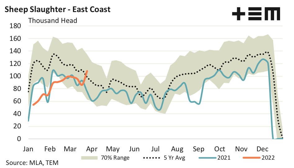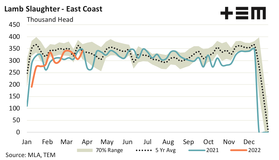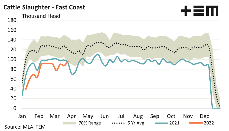 East coast red meat processing volumes have increased as we head towards the Easter break. Many processors use the opportunity to undertake repair and maintenance while slaughter volumes are reduced.