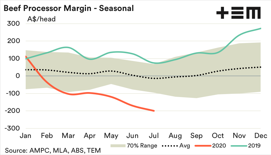 Processor margins for July extend their reach into negative territory to see average monthly losses of $200 per head of cattle processed.