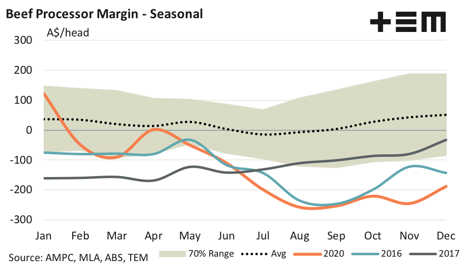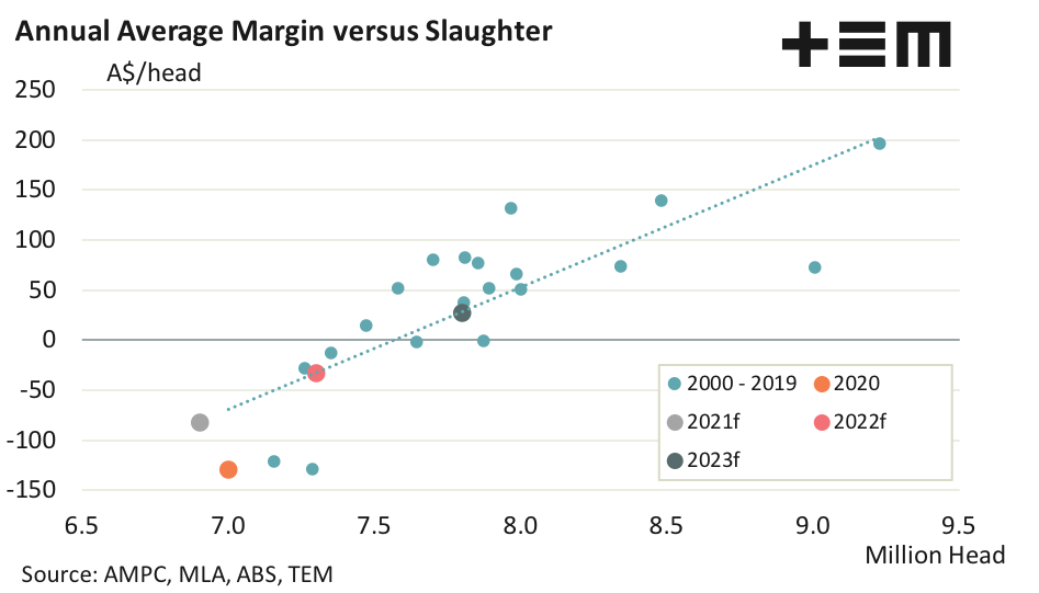Analysis of annual cattle slaughter volumes to the annual average margin shows a good degree of correlation between the two series, with low slaughter volumes often pushing margins into negative territory. A forecast slaughter of 6.9 million head for 2021 suggests another tough year is in store for beef processors with a linear line of best fit suggesting that an annual average loss of $80 is on the cards.