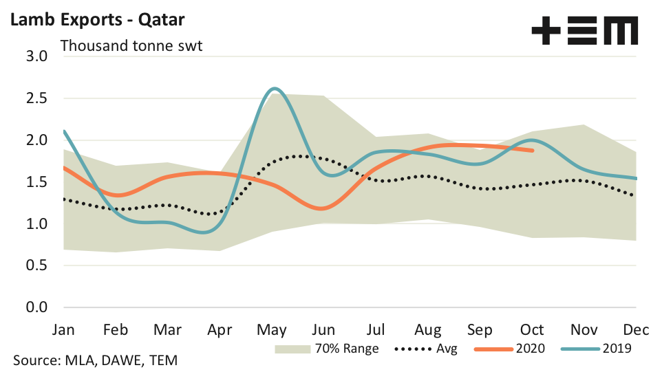 Average monthly Australian lamb trade volumes to Qatar had been running at around 1,619 tonnes swt per month this season, 13% higher than the five-year average trend, after rebounding strongly from the Covid-19 dip in volumes seen during May/June.